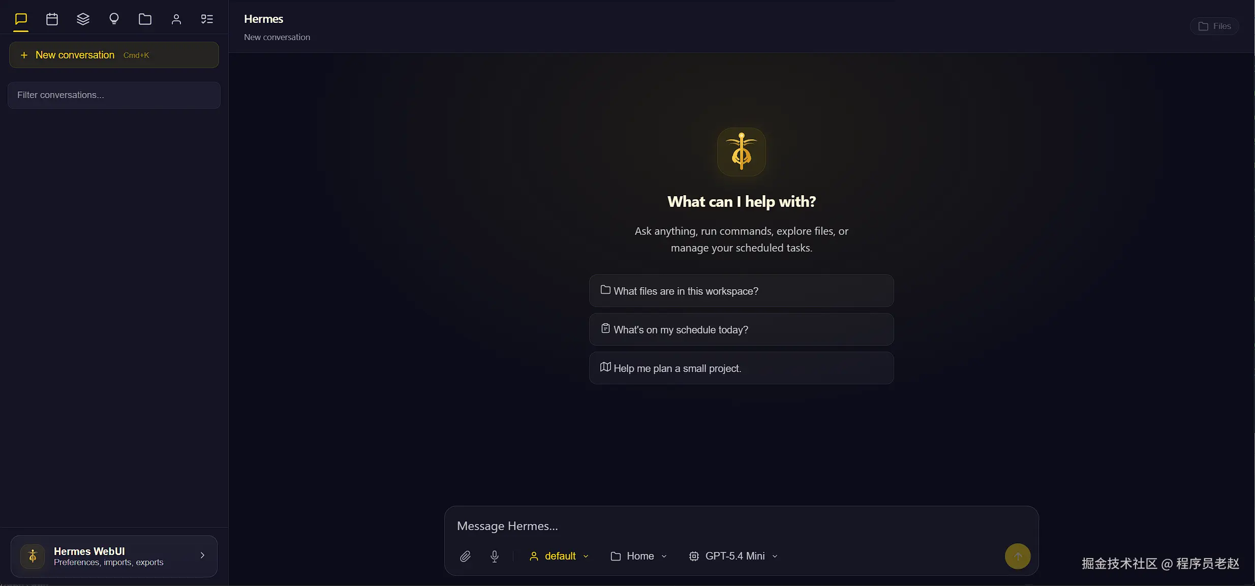 访问成功后,即可看到 Hermes WebUI 的可视化界面,后续操作都可以在界面上完成,比命令行简单太多。