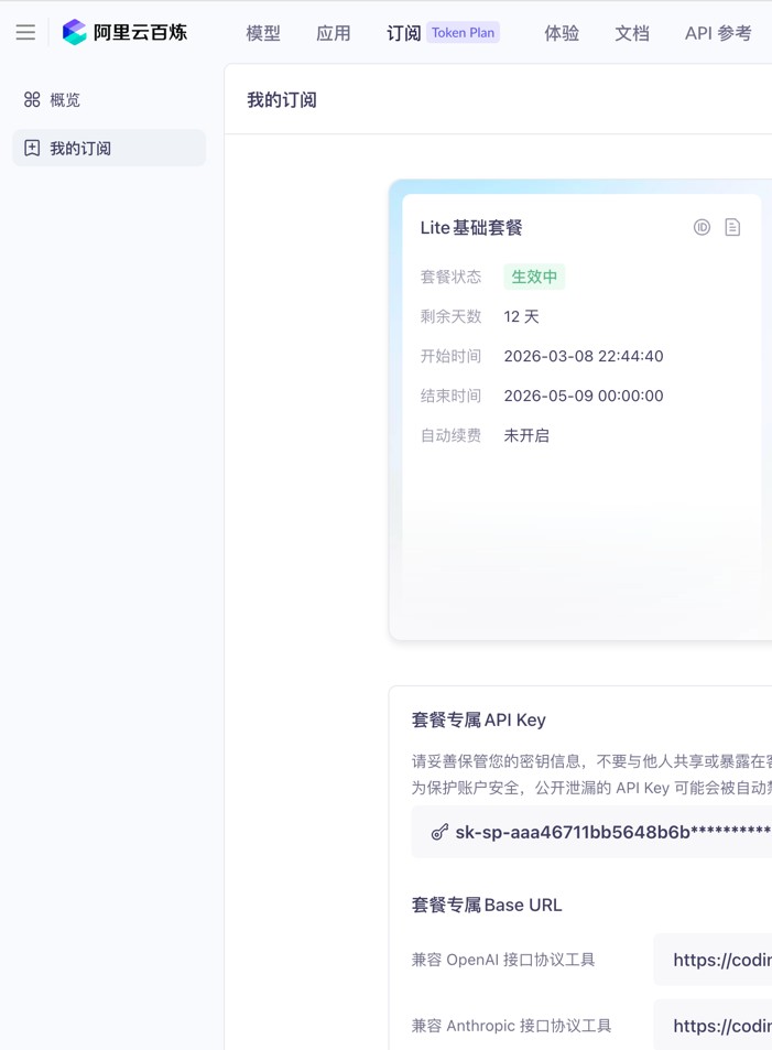 将 YOUR_API_KEY 替换为 Coding Plan 专属API Key;保存配置文件,重新打开一个终端即可生效。