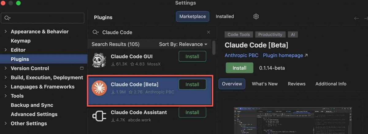 打开JetBrains扩展市场(Setting -> Plugins -> Marketplace),搜索 Claude Code 插件安装即可。