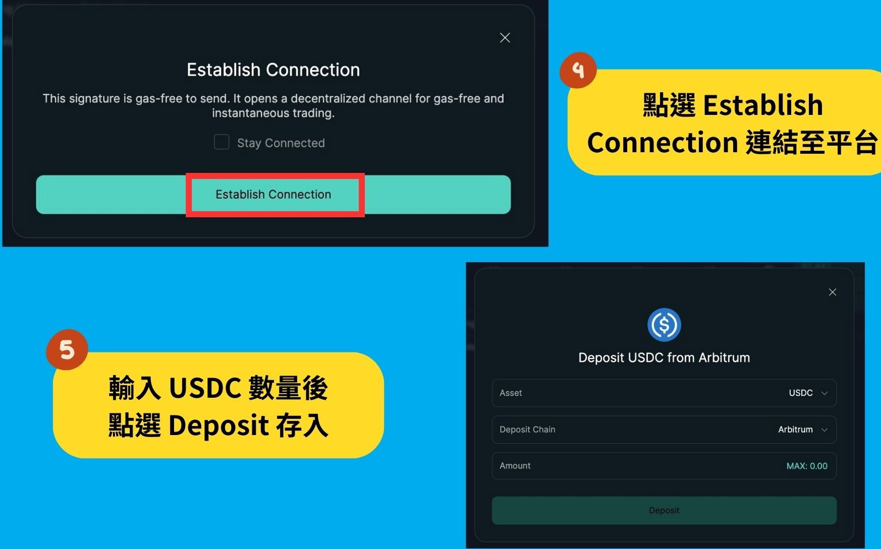 - 输入要存入的 USDC 数量后,点击 Deposit 即可存入资金。(若选择充值 USDT,系统会自动引导兑换为 USDC 再存入 Hyperliquid)