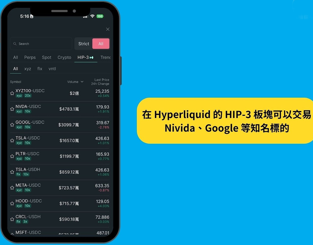 - Trade.xyz:专注于美股市场,例如 Nvidia、Google 或纳斯达克指数等主流市场。