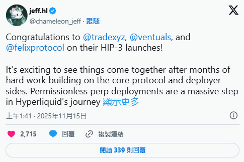 社群普遍认为,这是Hyperliquid 迈向下一波成长曲线的关键提案,把Hyperliquid 从「单一DEX」推向开放的衍生品基础设施层:包含股市指数、RWA、长尾资产等…都能更快上线。