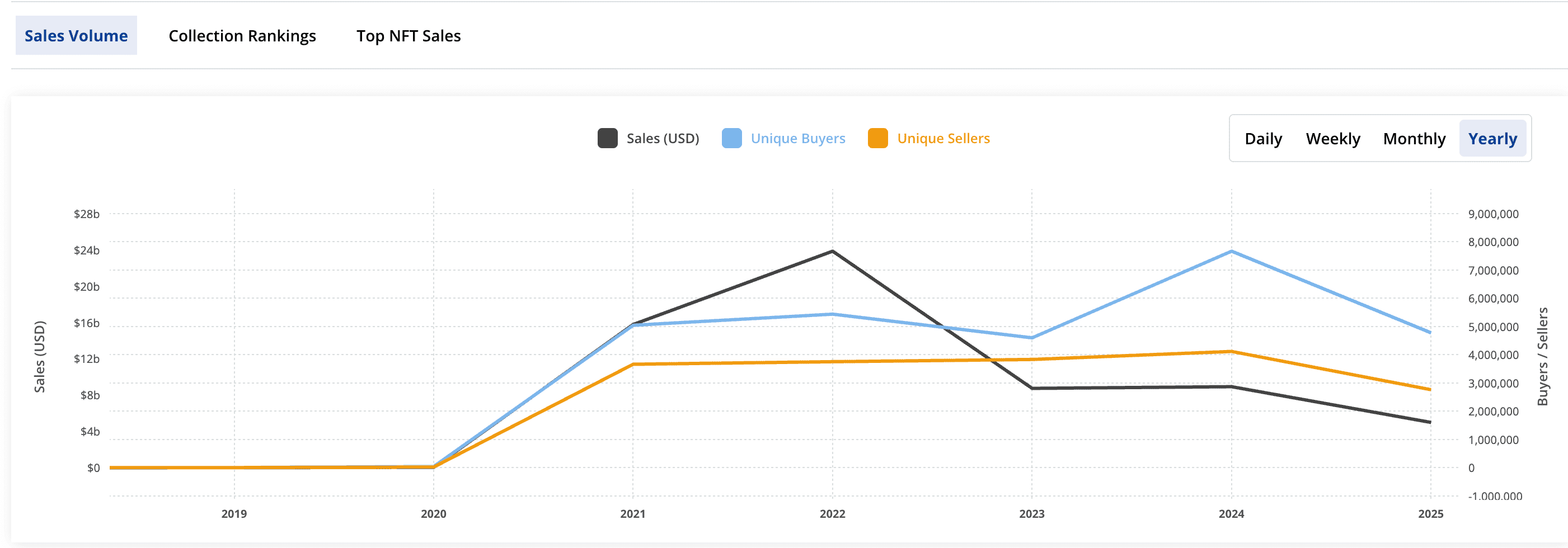 但最引人入胜的洞察来自用户数据。尽管图表中的黑线(销售额,以美元计)已从峰值大幅下跌,但蓝线(独立买家数量)却呈现出截然不同、更为乐观的景象。独立参与者的数量实际上在 2024年才达到峰值,达到760万买家,即便总交易量显著下降。这表明,虽然数百万美元的巨额交易已成过往,但 越来越多的个人用户正以更亲民的价格进入市场。NFT领域正变得更加广阔和分散,同时也不再像以往那样泡沫化。它正从高价值、低参与度的市场向低价值、高参与度的市场转型。