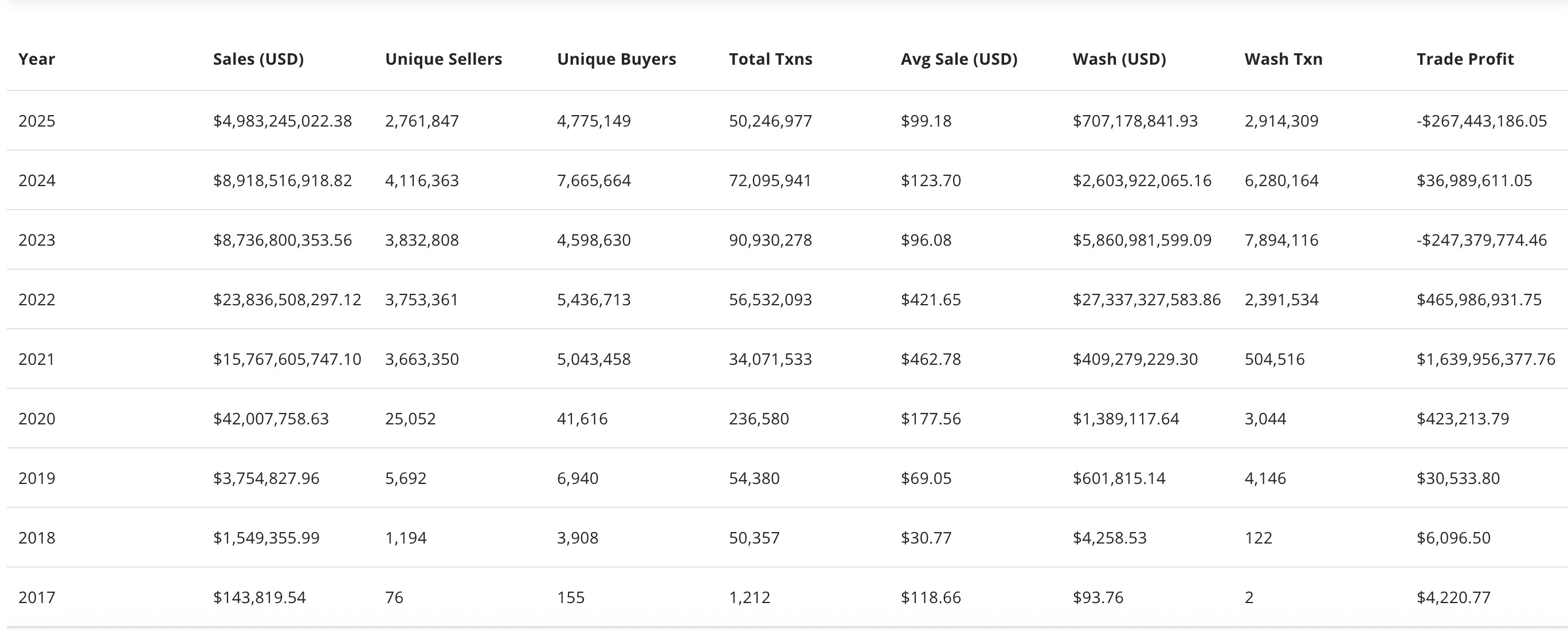 根据 CryptoSlam 的数据,全球 NFT 市场在 2022 年 达到投机高峰 ,当年总交易量估计有 273 亿美元来自虚假交易。这种普遍存在的做法,即用户同时在交易的买卖双方进行操作,人为地抬高交易量和价格,表明“真实”的自然市场规模一直较小。随后的下跌并非崩盘,而是回归到更为诚实的市场基线。