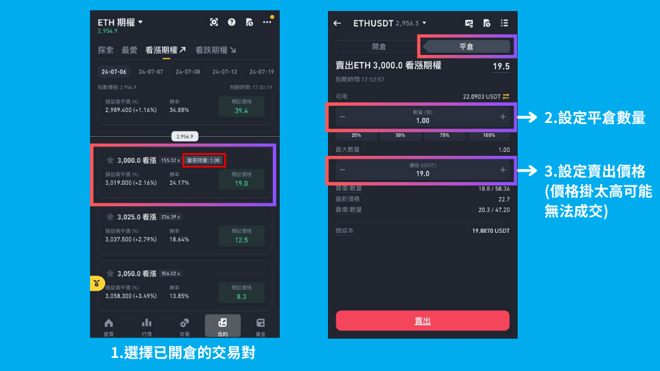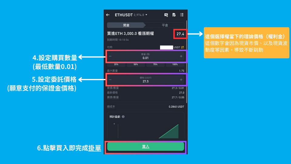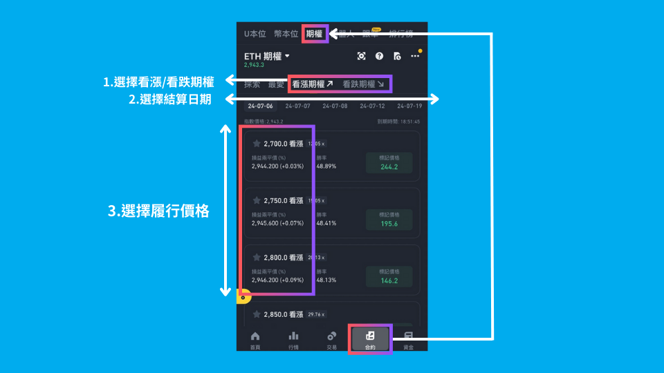 以下币安期权的示范以购入ETH 预期看涨期权为例: