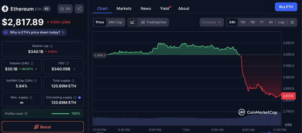 以太坊(ETH)币2025年11月价格预测 : ETH 会再次突破4000美元还是跌破30