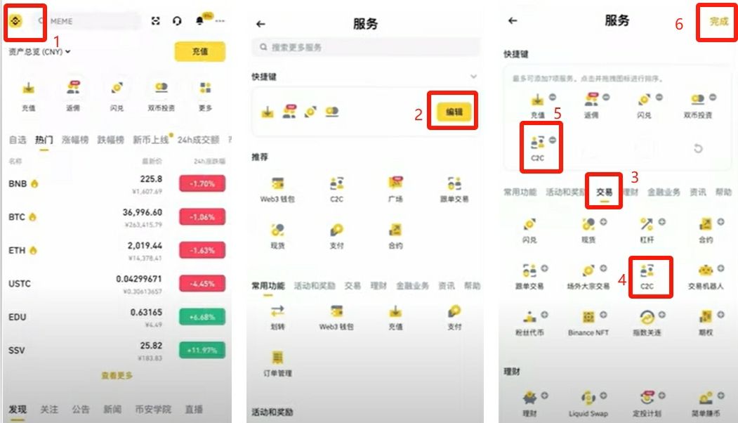 点击左上角的币安图标,进入功能页面。因为C2C法币充值比较常用。我一般会把这个功能设置成快捷键。点击【编辑】,下拉到【交易】的位置,找到【C2C】,点击边上的“+”号。这时候C2C就出现在上边快捷键的区域里了。然后点击右上角的【完成】,功能就固定下来了。