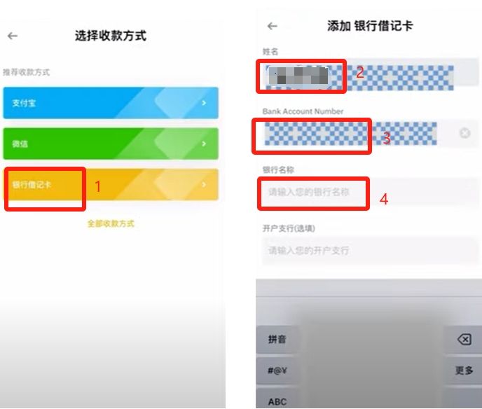 我们可以看到,可以添加微信、支付宝的收款码和银行卡。我们就点击【银行卡】,就能看到你的名字是固定的,就是你实名认证的名字。输入你的银行卡号码,再输入银行的名称,点击确认。