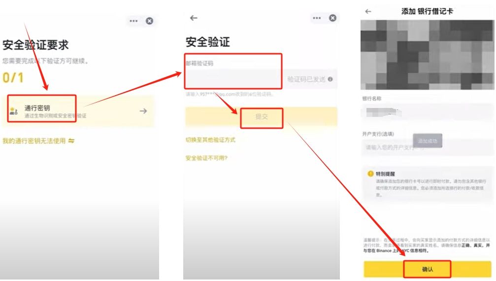 接着要进行一个安全验证,我这里显示的是通行秘钥,如果你没有打开通行秘钥,一般都是邮箱验证或者手机号验证。我这里也切换成手机验证,方便大家操作。打开邮箱,找到最新发送的验证码,输入验证码,点击【提交】。再点击【确认】,银行卡我就绑定成功了。