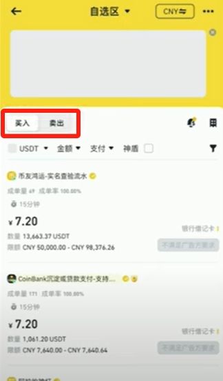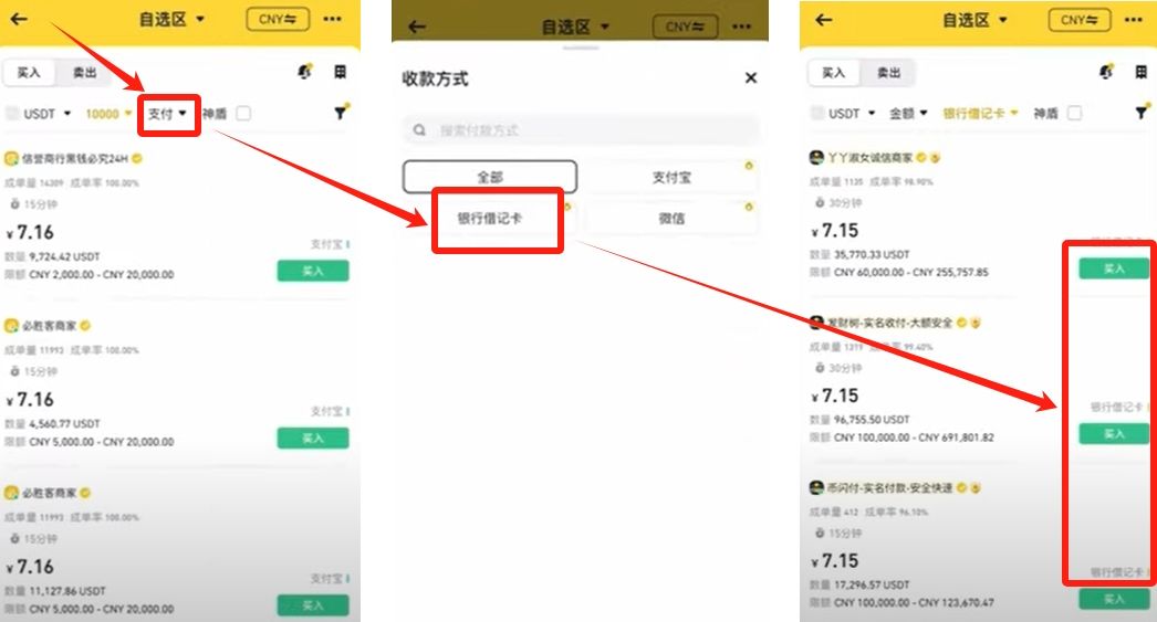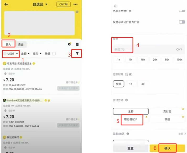我们要先买USDT。我们先看这里是USDT,上边是买入,然后点击右边的漏斗标志,往下拉。总额这里输入100,交易方式这里选择【银行卡】,点击【确认】进行筛选。