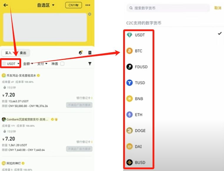 这里有个“USDT”就是你交易的种类。我们点击这个USDT,可以看到平台支持的数字货币类型有USDT、BTC、ETH、DOGE、DAI等种类。可以直接用法币购买成BTC、ETH、DOGE等有价格波动的加密货币。但我们老韭菜一般都是买成USDT。然后挂单购买BTC的。因为直接在C2C购买加密货币,是有很大的价差。另外就是USDT挂单可以等待时机,在价格比较低的时候进行交易。而C2C只能是当前的价格进行交易。