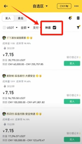 后面还有一个【神盾】。点击后面的小框,勾选上以后就是神盾商家。神盾商家都是在币安平台交了10万美金的押金的。而且他从这里买币或者卖币被冻结了的话,会有一定的赔付。相对的冻卡风险也小一些。
