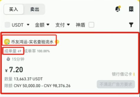 然后大家看这个具体的商家页面,这里有一行是商家的名字。下面是成交量,是说这个商家一共进行了多少次交易。成单率就不用说了。接着是价格,就是说这个商家每个USDT的价格。例如现在是7.2,1个USDT就是7块2块,1000个就是7200块。下面的数量是这个商家,现在还有多少USDT可以卖给你。最下面的限额是说,在这个商家这里买一次最少购买5万块的USDT,低于五万块的单子,商家不接。
