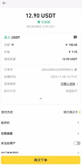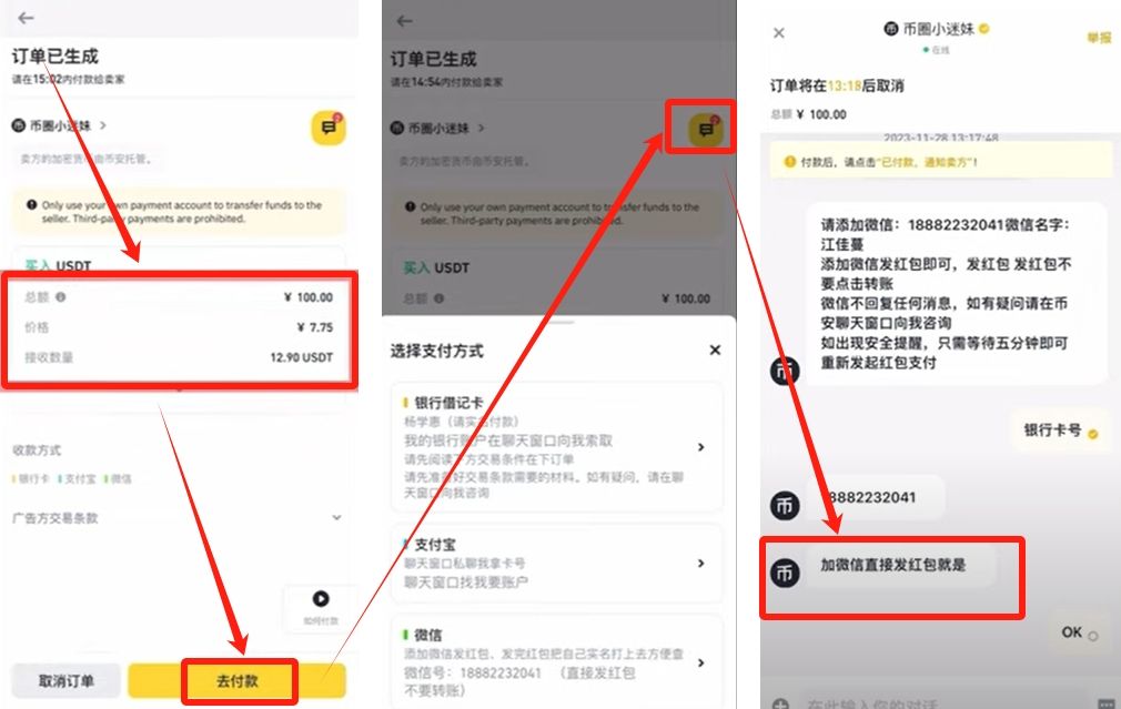 可以看到总额是100块,单价是7.75,可以买到12.9个USDT。点击下面的【去付款】,就可以看到对方的备注。没看到他的银行卡号,我们点击右上角的对话框跟他聊天,要他的银行卡号。它要求必须微信发红包。