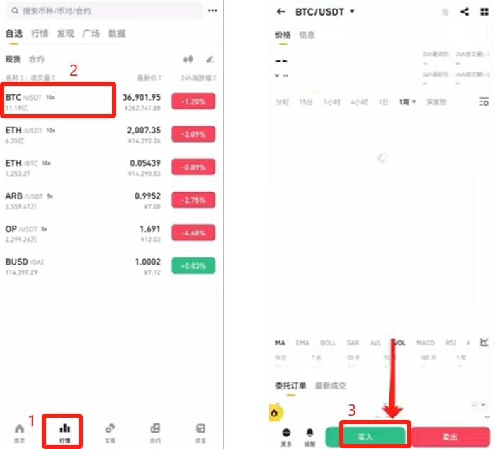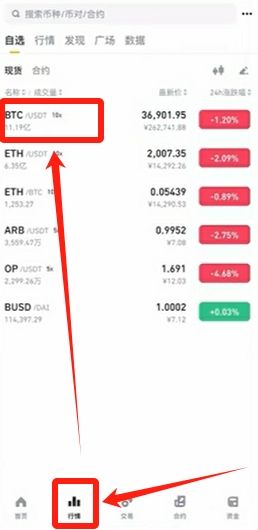 如果你想卖出BTC,可以还是像刚才一样,点击【行情】,上方选择“BTC/USDT”交易对。