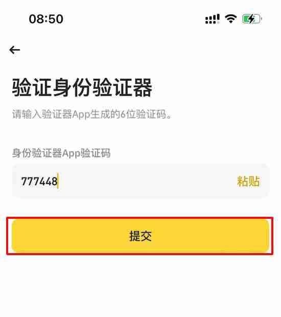 9. 返回币安APP,使用新启用的币安身份验证器验证您的设置请求。点击 [下一步],输入币安身份验证器中的 6 位数代码,然后点击 [提交]。