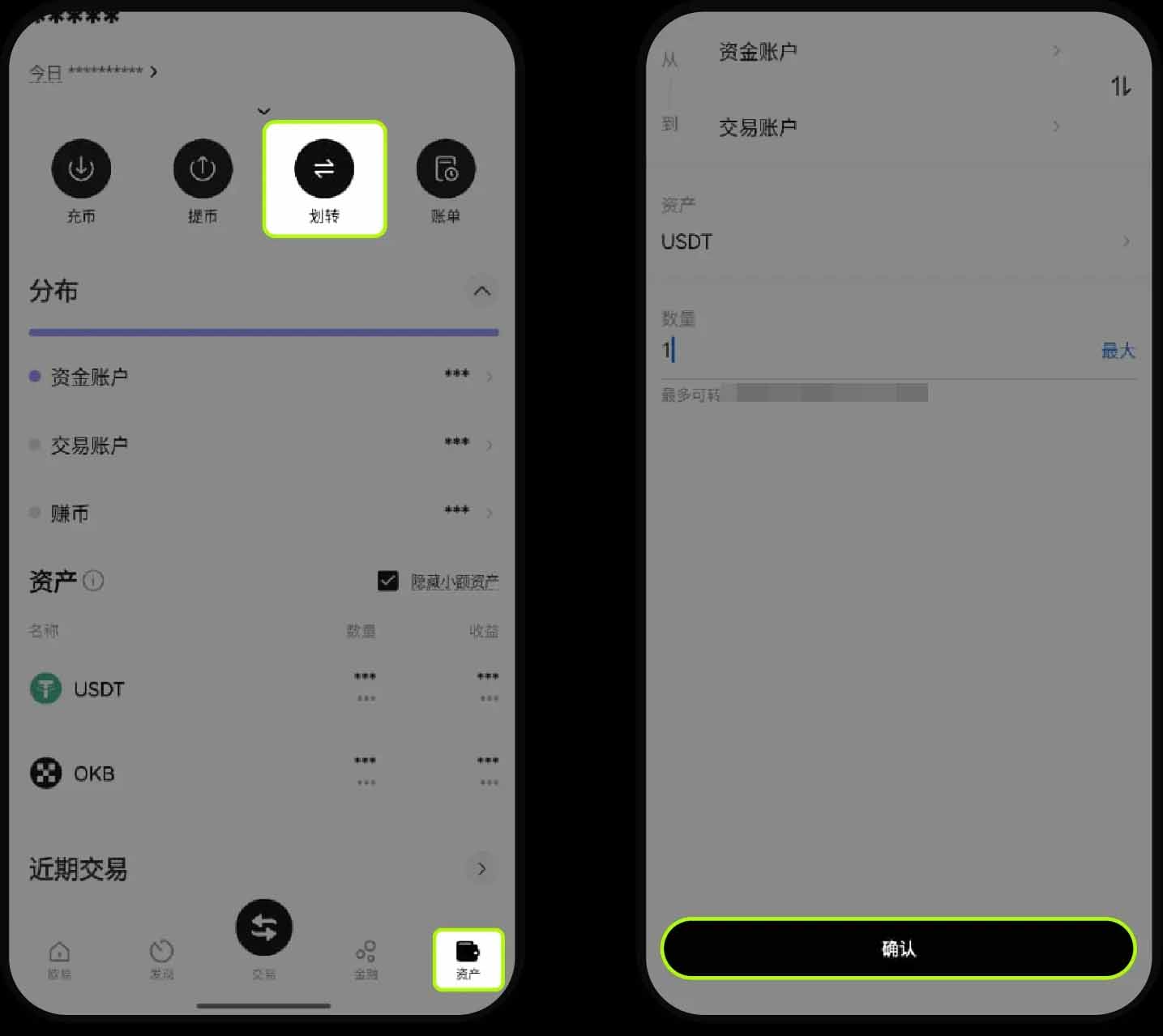 在进行现货杠杆交易之前,首先需要先进行资金划转。打开 OKX App(官方注册 官方下载)邀请码:jbzj999,点击【资产】—【资金划转】,选择币种以【USDT】为例 — 从【资金账户】— 到【交易账户】— 输入划转【数量】—【确定】。