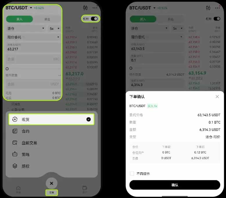以 BTC/USDT 杠杆交易为例:打开 OKX App【交易】-- 选择您要的交易模式 — 打开右上角【杠杆】模式。选择【全仓/逐仓】、【限价委托】、【USDT保证金】、【杠杆倍数】— 输入【价格】、【数量】—点击【卖出BTC】—【确认】。