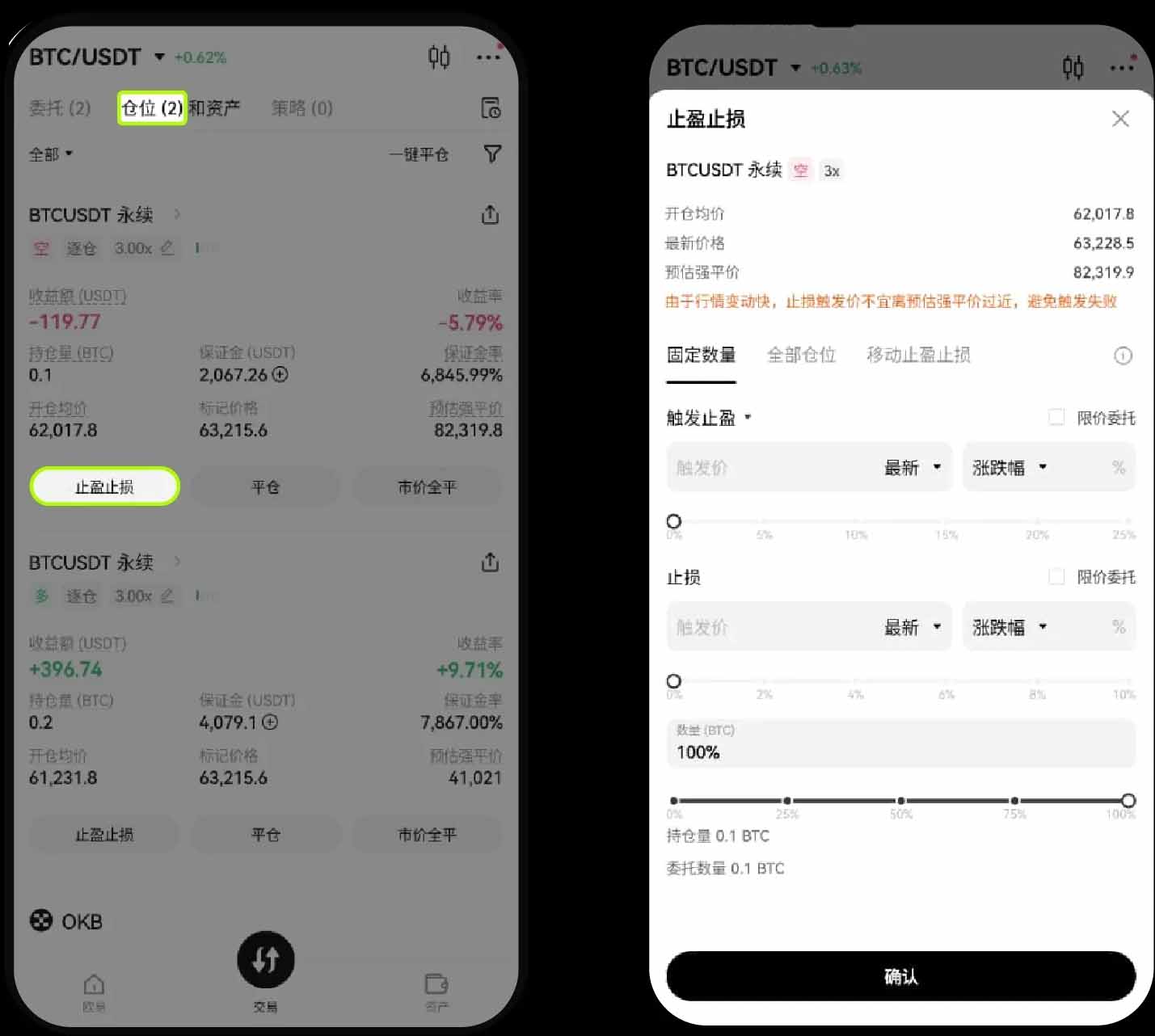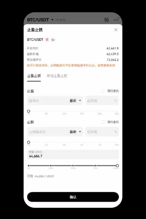 温馨提示:用户也可以选择【止盈止损】的方式来平仓,从而及时止损减少损失,或者及时止盈锁住利润。选择具体要平的仓位点击【止盈止损】 — 输入【止盈触发价格】、【止损触发价格】、【数量】—点击【确定】。