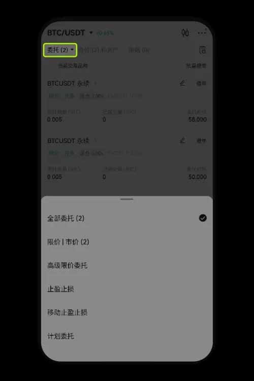4. 挂单查找在开仓主页面下方,点击【当前委托】—选择当前委托方式【止盈止损】即可查看当前挂单,也可以点击【撤单】撤销挂单,点击【全部】查看历史委托。