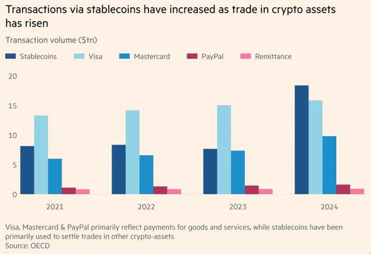 总而言之,稳定币——被宣传为法定货币(尤其是美元)的数字替代品——似乎拥有光明的前景。正如泰特(Tett)所指出的,“渣打银行等机构预测,到 2028 年,稳定币行业的规模将从 2800 亿美元增长到 2 万亿美元”。