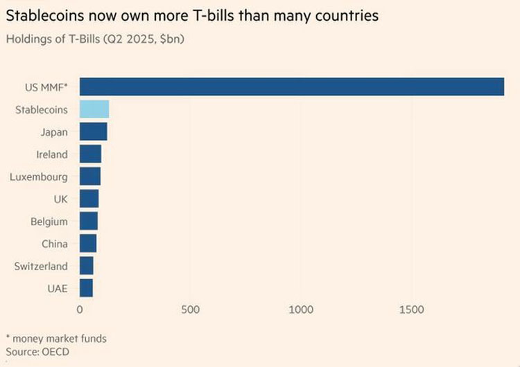 《金融时报》的吉莉安·泰特(Gillian Tett)在上个月的一篇文章中提出了特朗普政府对稳定币持欢迎态度的另一个动机。美国财 政 部长斯科特·贝森特(Scott Bessent)面临一个难题:美国需要全世界以较低利率持有巨额的美国国债。她指出,一个解决方案是推广美元计价稳定币的广泛使用,重点不在于国内,而在于全球。正如泰特所指出的,这对美国政府有利。