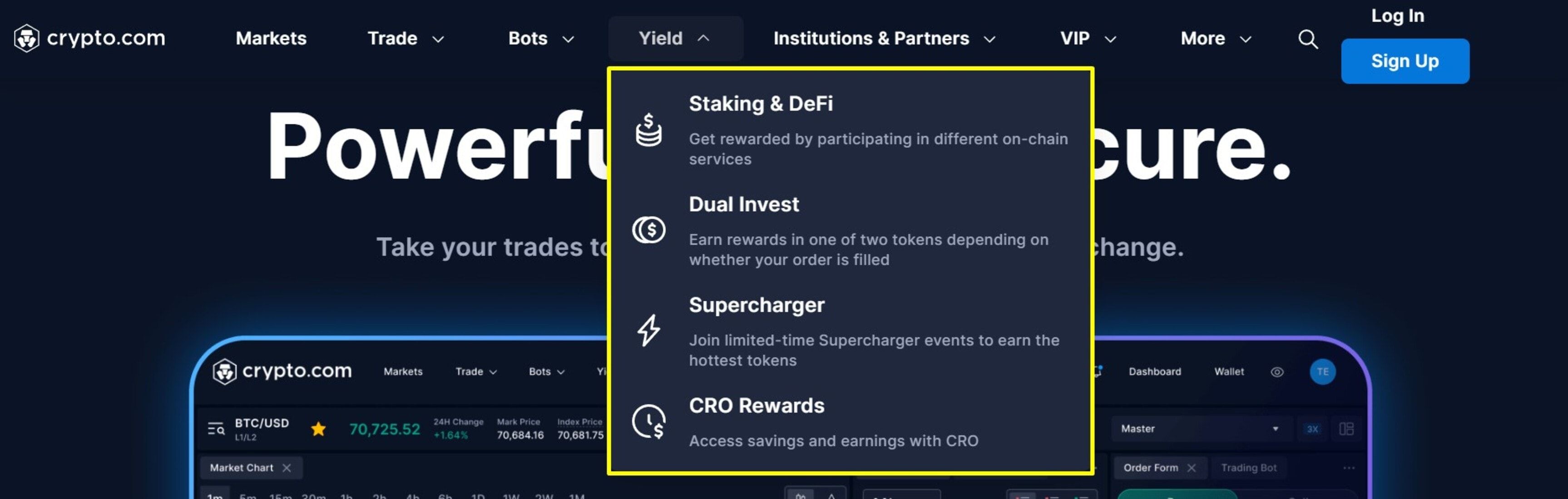 - Crypto.com 收益:Crypto.com 通过其 Crypto Earn 套件提供多种被动收入途径,包括质押和 DeFi、双重投资、超级加速器和 CRO 奖励。