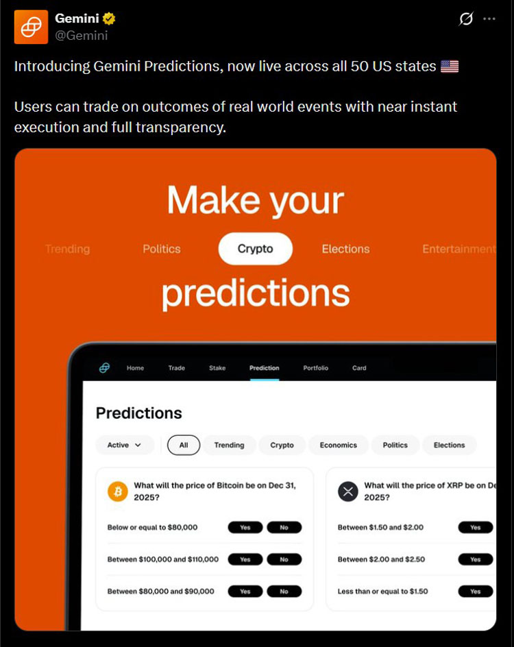 与此同时,由 Winklevoss 领导的 Gemini 加密货币交易所在美国推出了预测市场,并获得了必要的监管批准。