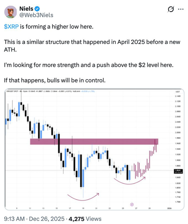 “与类似观点不谋而合,Posidonia21资本合伙公司首席执行官耶稣·佩雷斯向Cointelegraph表示,随着我们步入新的一年,XRP的股价可能会呈现横盘整理态势。佩雷斯称:‘在建设性的市场环境下,我们预计XRP将维持在当前水平附近,而非开启强劲的新趋势。’”