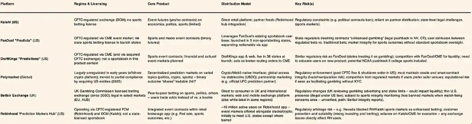 作为回应,FanDuel 与 DraftKings 等既有巨头将预测类产品限制在「尚无法律体育博彩」的司法辖区内,凸显分发策略正由监管边界而非用户需求主导。其核心含义已十分清晰:决定规模的不是产品创新,而是监管容忍度。合约设计、结算条款、营销措辞与地理铺开路径,正被系统性地工程化,以通过法律定性审查;能够在被接受的监管框架内运营的平台,将获得更为持久的优势。在这一市场中,监管清晰度本身构成护城河,而不确定性则直接限制增长。