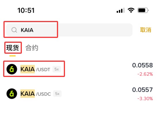 3、输入【KAIA】,这时下拉会显示【现货】【KAIA/ USDT】,点击【KAIA/ USDT】。(作为新手,不建议做合约,所以这里就不演示合约购买方式了。)
