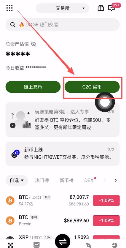 注册好之后,我们打开欧易交易所(点击下载 点击注册)。在欧易交易所的首页点击【C2C买币】。