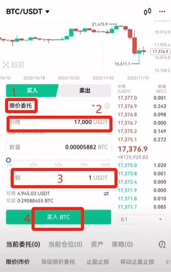 先来讲一下“限价委托”。比如说我现在要买比特币,但是我觉得这个价格有点高,我这边价格可以给他打进去我心仪的价格,比如说17000,我买个1U,点击【买入BTC】。