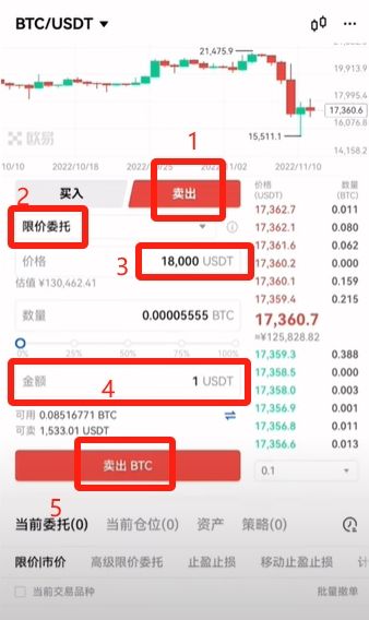 卖出的话比如说也是一个限价委托,我觉得这个价格有点低,我卖的高价,我输入比如说18000,卖个1U,点击【卖出BTC】。