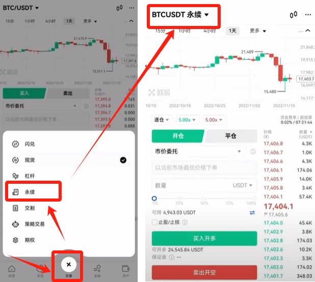 下方的交易按钮,是可以切换交易模式的。比如说现在我们是现货,永续就是合约,我们切换一下,就切到合约账户了。这里大家大概知道一下就可以。