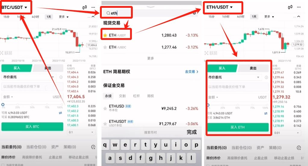 我们在现货里面如果要买别的币,比如说以太坊,点击左上角,在这里搜索“ETH”,点击“ETH/USDT”,就切换到以太坊的现货交易了。我们跟刚才一样也是可以买卖的,限价和市价都是可以的。