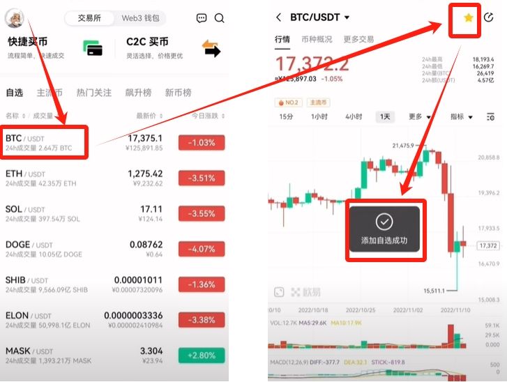 回到首页,往下滑可以看到最左边的“自选”,意思是你看到好的币给他加关注,就会自然而然到你的自选里面了。比如说第一个比特币,我们点一下,再点击右上角的小星星就添加到自选了。就是你看到了可以的币就给他添加到自选来,自己平时多关注关注。