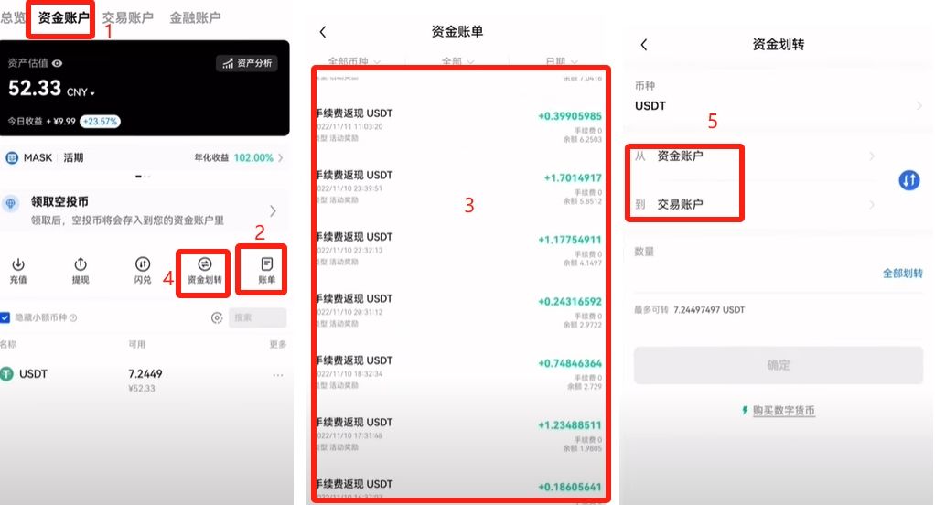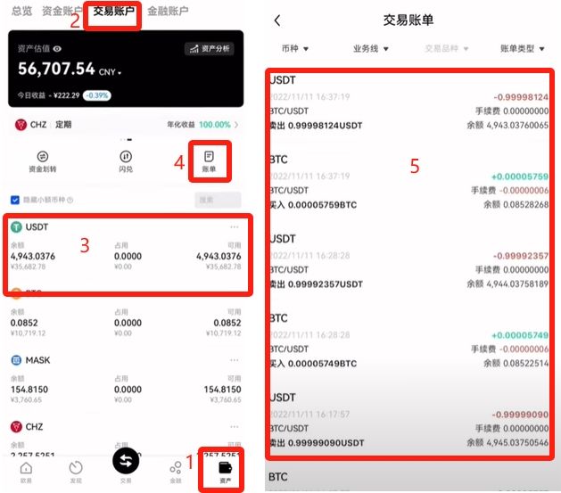 比如说我们买了几个比特币,我去哪里看有多少呢。点击右下角的【资产】,上方点击【交易账户】,我们可以看到我们有多少USDT。现在手上有的是折合成多少人民币的价格的不同的币,或者是有多少个币,这边都是可以看到。我们要看交易明细就点击”账单“,这里可以看到包括买了多少币,手续费付了多少都是可以看到的。