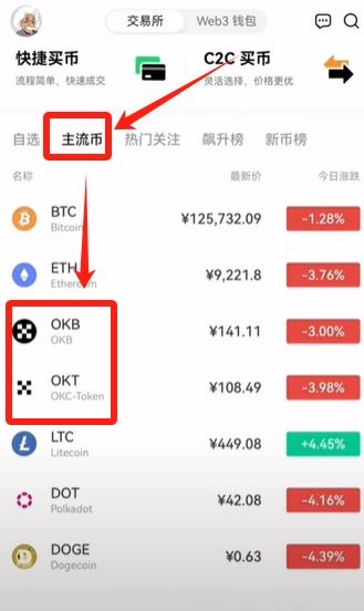 旁边的“主流币”的意思是它的市值比较大,就简称为主流。还有一种是平台自己的币,比如说OKB OKT,这个是欧易交易所的平台币。比如说你在币安交易所也会看到,除了一些市值比较大的主流币,还有一些是它自己的币叫BNB。