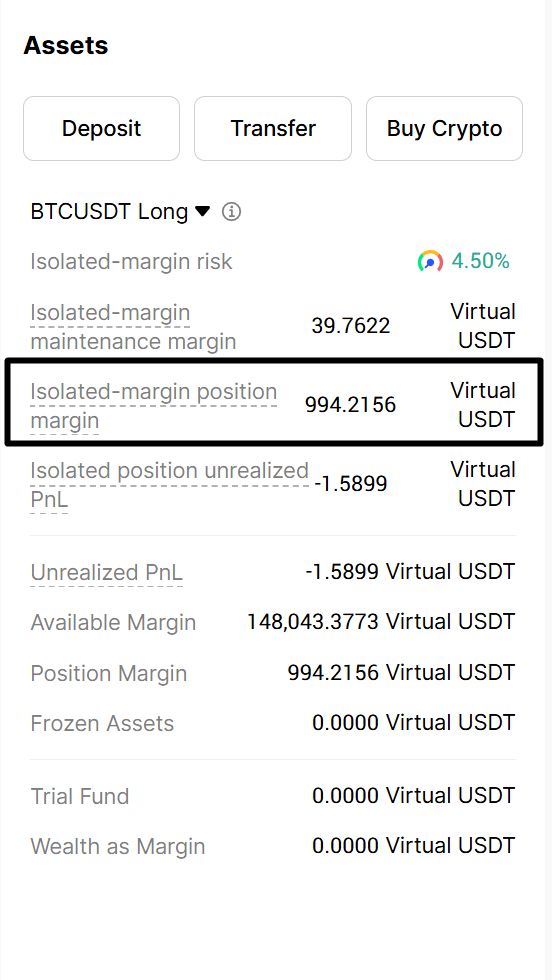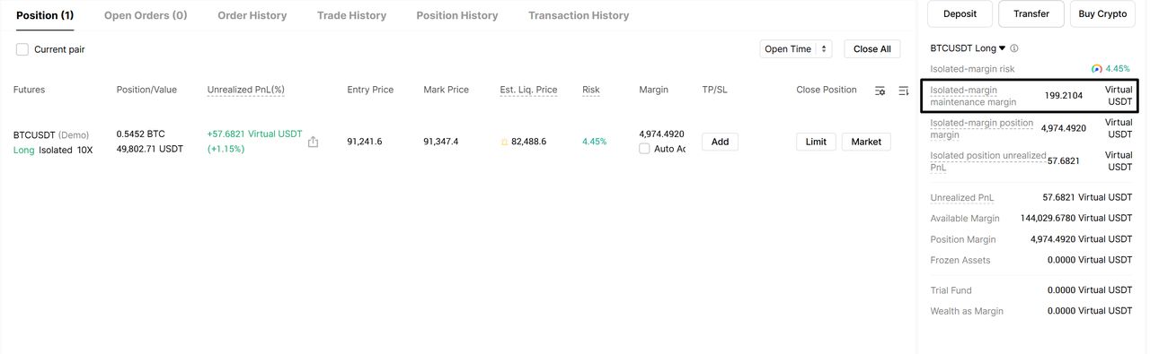例如,如果您以1,000 USDT 开立一个仓位,且维持保证金要求为40 USDT,一旦亏损达到960 USDT,就会发生清算。此时,系统会平仓以防止进一步的损失。