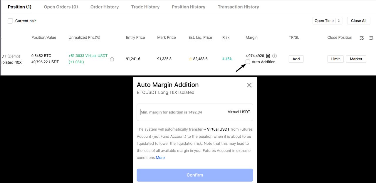 • 预设使用逐仓保证金:逐仓保证金将损失限制在单一仓位。即使交易完全失败,您期货余额的其余部分仍受保护。