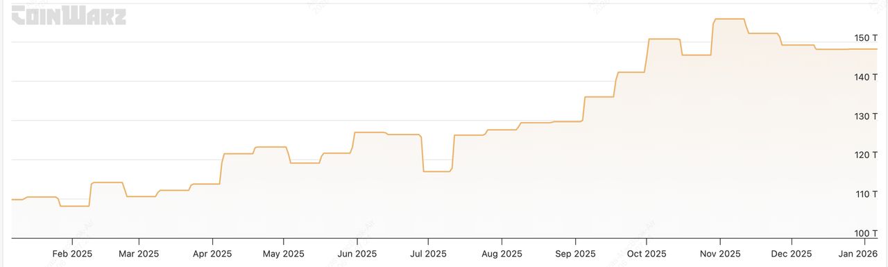 第三,难度趋势反映了矿工经济学和资本纪律。2025年1月,难度约为109兆次哈希,而2026年1月为148.26兆次哈希,年增长约35%。这种急剧的年度增长表明,即使减半后利润收紧,挖矿行业仍持续进行资本投资和效率升级。比特币价格、能源成本和难度之间的这种反馈循环确保只有最有效率的营运才能保持竞争力,强化了比特币向效率驱动的能源网络而非投机性混乱的演变。