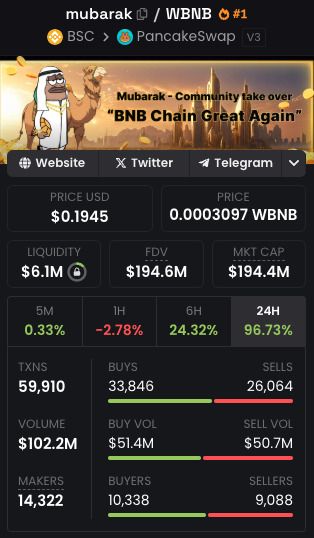 Mubarak(MUBARAK)是一款基于币安智能链(BNB Chain)的 Meme 币,于 2025 年 3 月推出,其名称来自阿拉伯语,意为「幸福」或「受祝福」,这让该币在中东市场拥有独特吸引力,自上线以来,Mubarak 迅速成为社区关注的焦点,交易量飙升,并成功超越 Solana 上的多个热门 Meme 币。