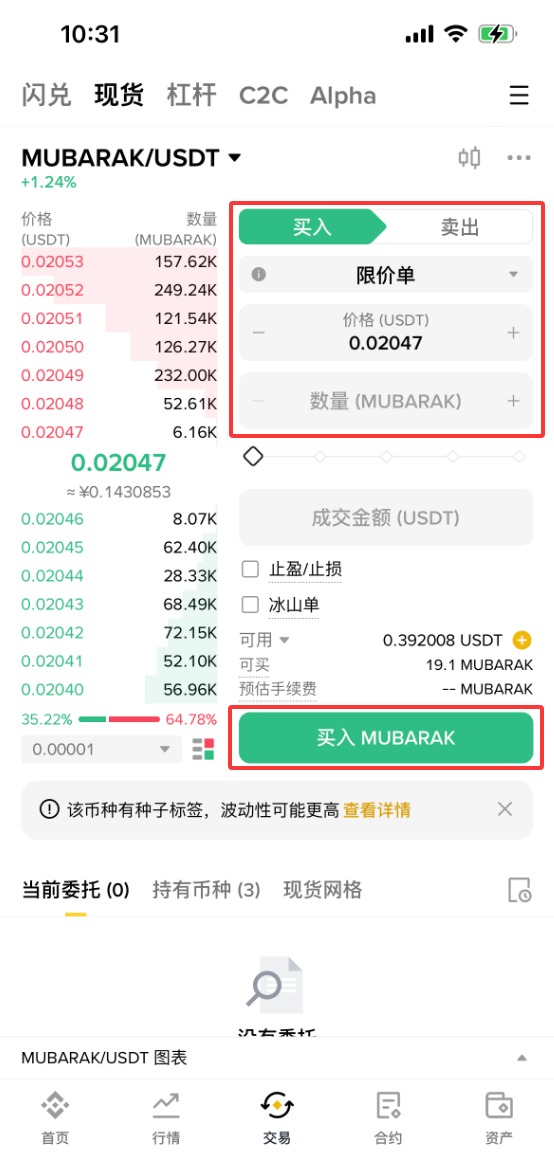 5、依次选择【限价单】-购买【价格】-购买【数量】-【成交数量】,设置好之后,点击【买入MUBARAK】。