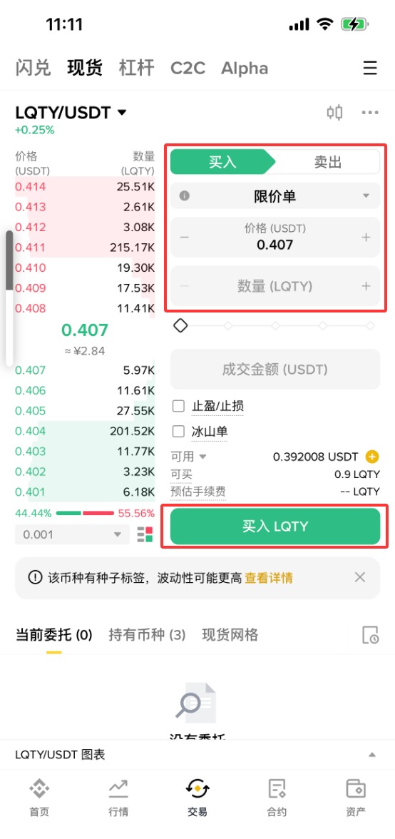 5、依次选择【限价单】-购买【价格】-购买【数量】-【成交数量】,设置好之后,点击【买入LQTY】。