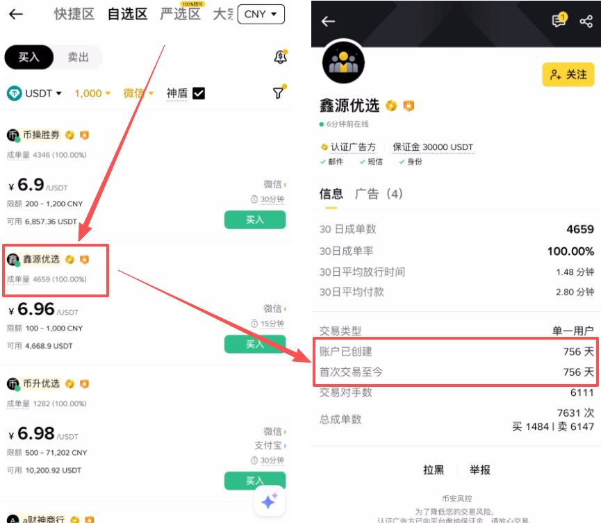 - 看注册时间(关键): 点开商家主页,查看“账户已创建时间”和“首次交易时间”。建议选择注册 1 年以上的老商家。存活时间越久,说明其资金来源越干净,账户越安全。