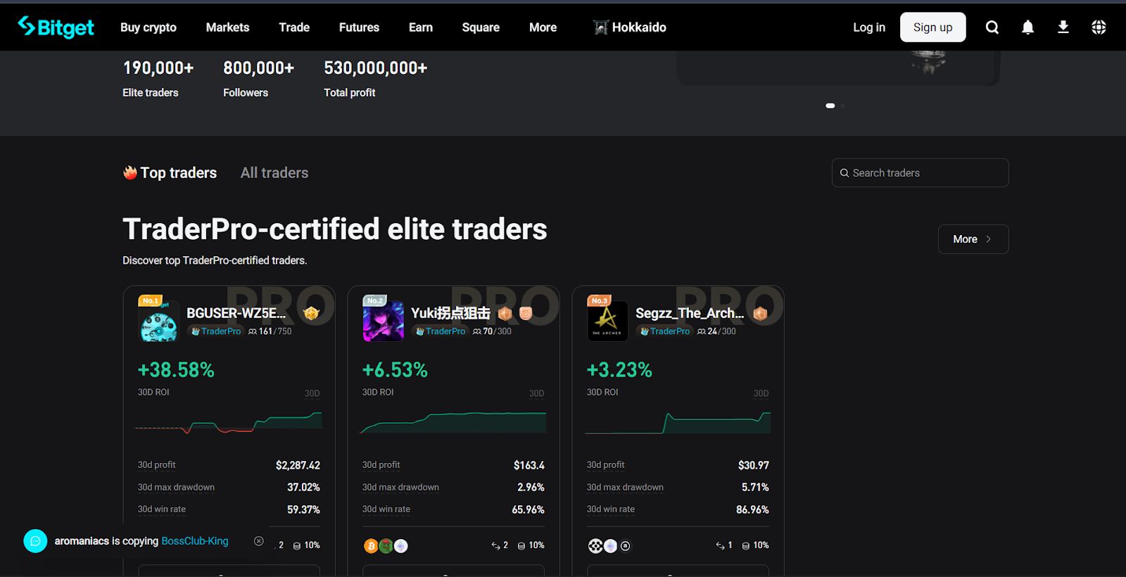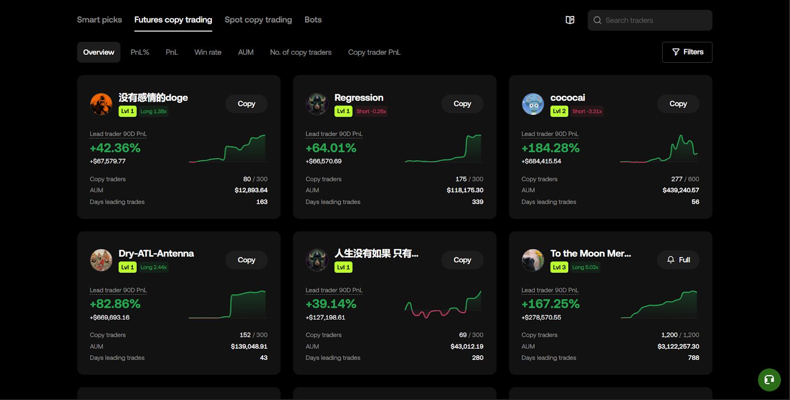 - 全面的业绩数据:Bitget 为您提供做出明智决策所需的一切信息。您可以查看交易员的总盈亏 (PnL)、投资回报率 (ROI)、胜率和管理资产规模 (AUM),找到符合您风险承受能力的交易员。