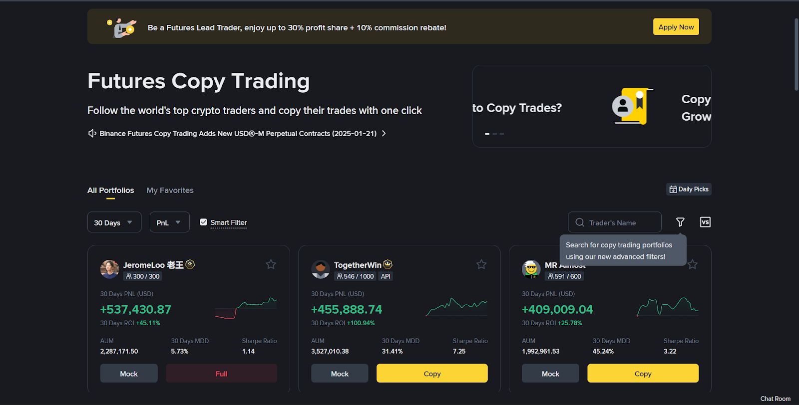 - 排行榜和筛选功能:平台的排行榜可帮助您快速找到表现最佳的交易员。您可以根据各种指标进行筛选,包括投资回报率、总利润和粉丝数量,从而更轻松地找到符合您财务目标的投资策略。