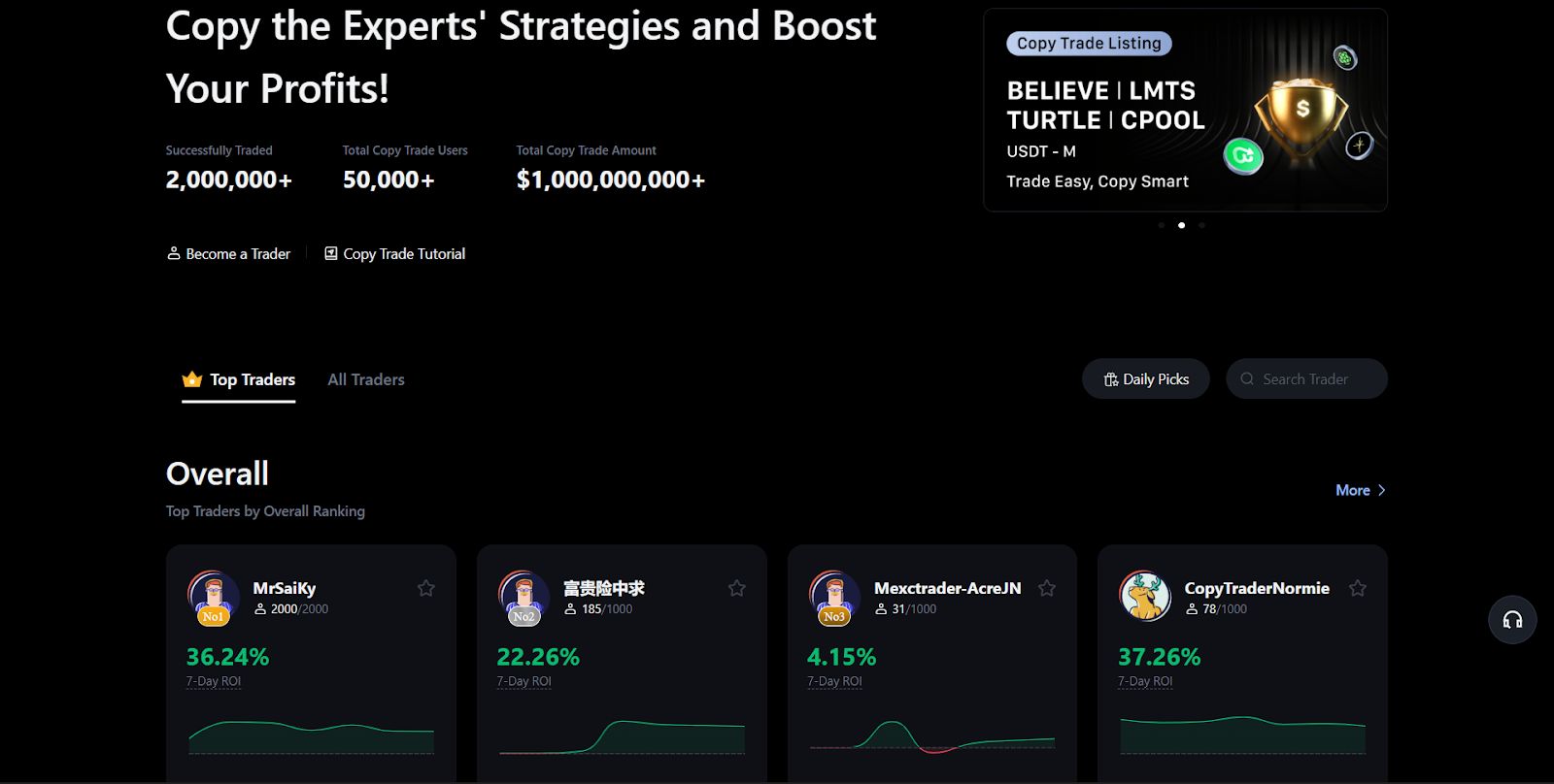 - 跟随佼佼者: MEXC 让您轻松复制业绩最佳的交易员的交易策略。您可以查看他们的投资回报率、盈亏和胜率,然后让平台为您复制他们的交易。