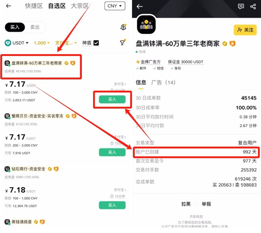 下面就是一些比较符合我们要求的商家了,我们首先可以去看一下他们的成单量和成单率,找一个成单量比较大,成单率也比较高的商家。点开他的主页,查看一下他成为商家的时间,也就是账户已创建。尽量去选择成为商家半年以上的,因为他的账户存活的时间越久,就证明他的资产越安全,我们就可以更放心的去跟他交易。确认跟他交易之后,点击这里的【买入】。